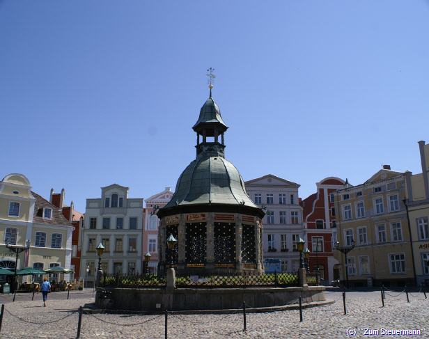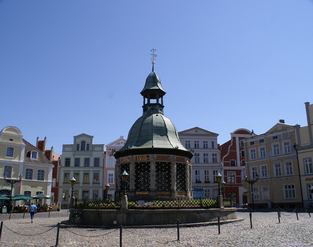 Das aus der Spätrenaissance stammende Bauwerk wurde in den 70er Jahren unseres Jahrhunderts restauriert, jedoch unter Aussparung der früheren Brunnenfiguren Adam und Eva, deren Originale im Stadtgeschichtlichem Museum ausgestellt sind. Kopien zieren heute die Nordseite der Wasserkunst. Die "Wasserkunst" und der "Alte Schwede" rivalisieren um die Gunst als Wahrzeuchen der Hansestadt Wismar